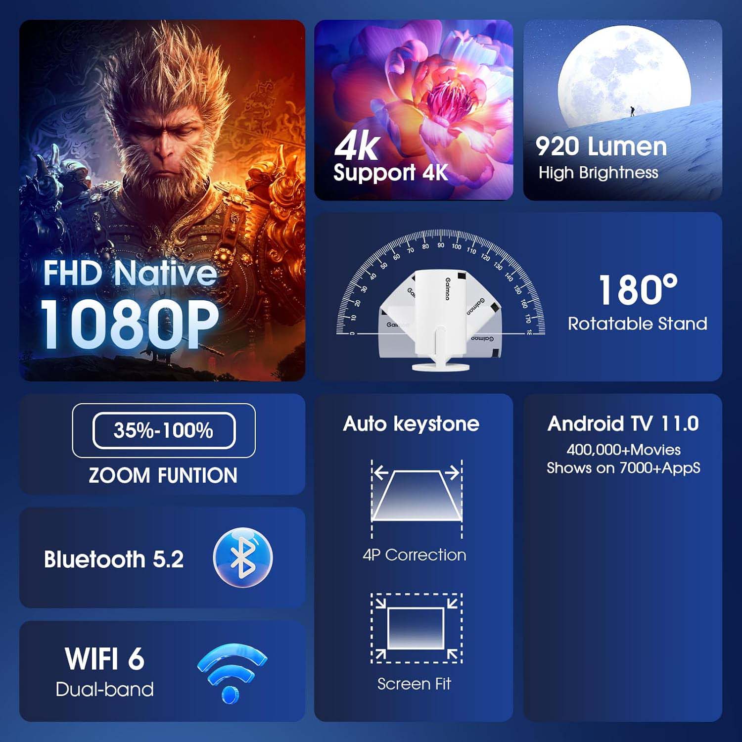 The WiFi 6 and BT5.2 compatibility provide ultra-fast connectivity, while the 180° keystone correction ensures perfect alignment, even from unconventional angles. With multiple ports, including HDMI, USB, and AV, it connects effortlessly to a variety of devices such as smartphones, laptops, PS5, and TV sticks.