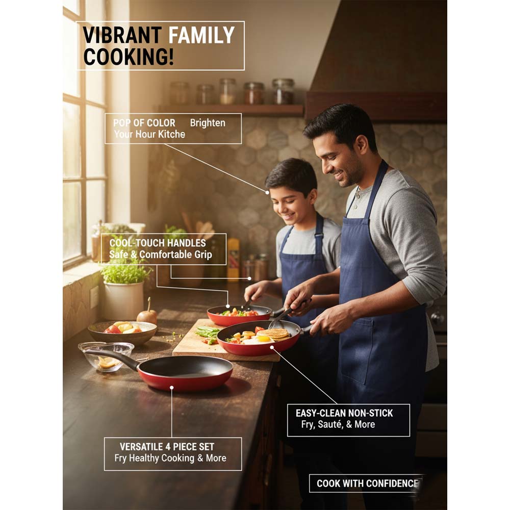The OE-017 4-Piece Non-Stick Frying Pan Set in a vibrant red finish combines exceptional kitchen functionality with a bold and stylish aesthetic. This comprehensive set is designed to handle all your cooking needs, featuring three durable frying pans in practical sizes—typically 20 cm, 24 cm, and 26 cm—allowing you to effortlessly prepare multiple dishes at once or select the ideal pan for any recipe, from a small side dish to a large main course. Each pan is crafted with a robust aluminum body that ensures rapid and even heat distribution for consistent cooking results without hot spots. The high-quality non-stick interior coating guarantees easy food release, promotes healthier low-oil cooking, and makes cleanup remarkably straightforward. The set is completed with a matching red nylon spatula that is gentle on the non-stick surfaces, preventing scratches while you cook.